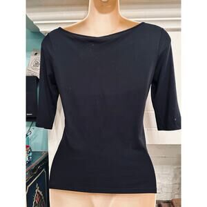 VINTAGE EIGHTIES 80's BLUMARINE TOP IN BLACK WITH RHINESTONE CUTOUTS. SHORT TO 3/4 SLEEVES. CHEST STRETCHES TO 20" ACROSS. LENGTH IS APPROXIMATELY 20".
