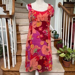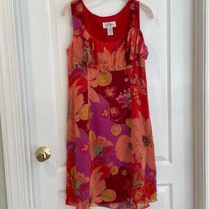 VINTAGE BOB MACKIE STUDIO SILK FLORAL REDS/ORANGES DRESS SIZE 10 PETITE
