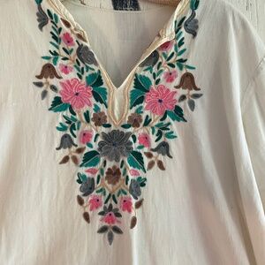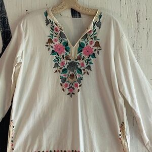 Beautiful 1970’s Floral embroidered neck line, cuffs and hem blouse. Relaxed fit 100% cotton. I am not sure of the orgin could be India or other folklore wear, there are no tags.
