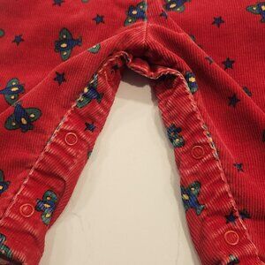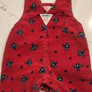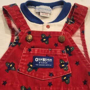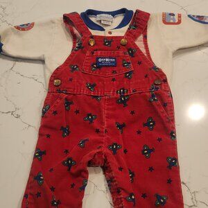 Highly sought after Vintage Oshkosh boys 3-6 month outfit. Red Cordroy overalls with airplane print has matching light sweatshirt white top with matching airplane print. I purchased this in 1990 and it has been in storage since 1992. It was lightly used but has much more wear in it. Made in the USA.