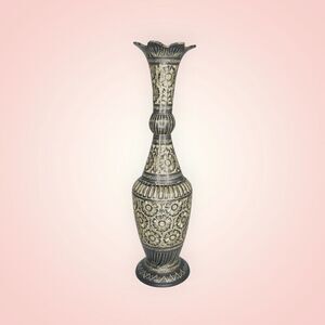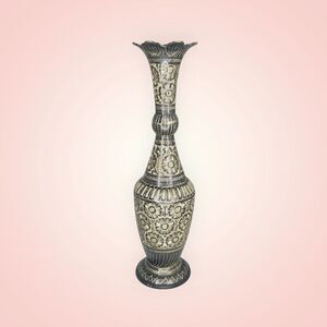 VINTAGE BRASS VASE Hand Etched Floral Pattern Made In INDIA Black gold 11"