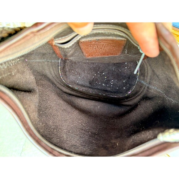 Vintage Brighton Brown Leather Croc Embossed Crossbody Bucket Bag is a stylish and practical accessory for women. The semi-circle shaped bag features a zip closure, brown leather handle/strap with silver hardware accents, and a classic heart charm. Made of leather with a matte finish, this limited edition bag is perfect for travel, casual outings, or business meetings. The brown exterior color and brown leather lining add a touch of elegance to this timeless piece from the Brighton Melanie collection. Made in the United States, this bag is a must-have for fashion-forward individuals looking for a versatile and high-quality accessory.