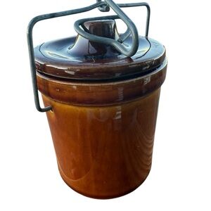 VINTAGE BROWN STONEWARE CROCK JAR WITH LID & METAL HANDL