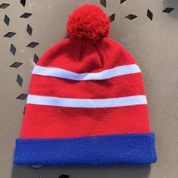 VINTAGE BUDWEISER Beer Beanie Winter Hat Pom Pom USA red, white, and blue