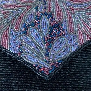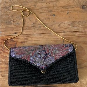 Beautifully beaded vintage evening clutch - black with flower beadinf detail in violet, blue, and rose colors. Black satin interior. In gorgeous condition. Gold metal chain.