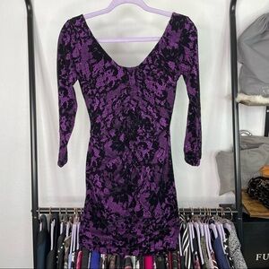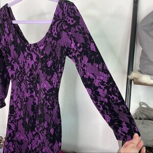 VINTAGE Betsey Johnson Purple And Black Lace Print Bodycon Scoop Neck Mini Dress