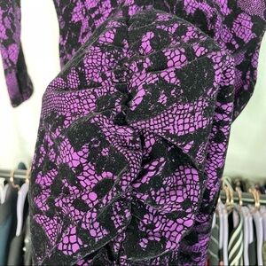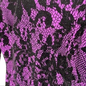 Very rare style. Deep scoop neck in the front. V cut in the back. Flattering ruching in the back/butt. 3/4th length sleeves. Purple with black velvet printed lace. Size P. Has some stretch. Hi low hem.