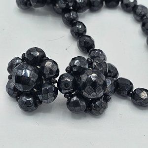VINTAGE Black Fauceted Jet Glass Necklace Cluster Clip-on Earrings Western Germa