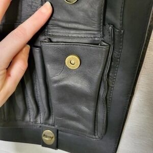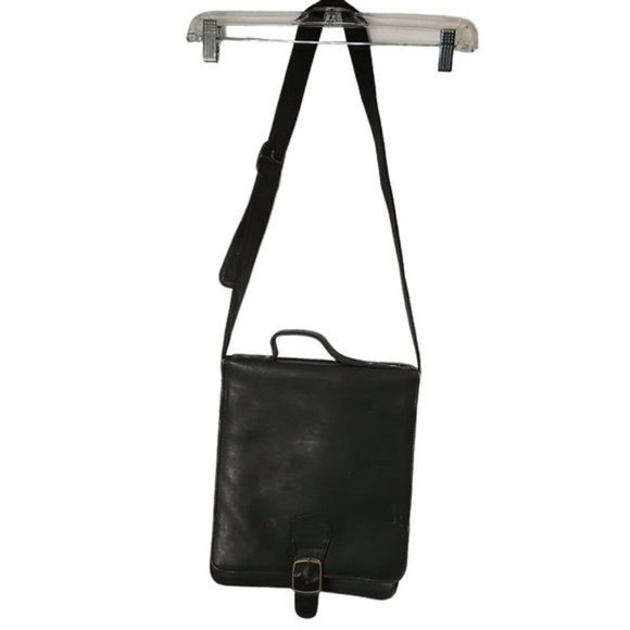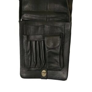 Vintage Black Leather Messenger Bag 80s Plaid Interior Pockets Adjustable Strap