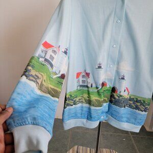VINTAGE Blair Women’s Long Blue Light Houses Cardigan Sweater (Size: Medium)