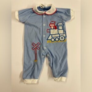 This charming one piece from Gymboree showcases a delightful train appliqué on a blue and white base. Designed with comfort in mind, it features short sleeves and snap closures for easy dressing. The playful style makes it a perfect choice for everyday wear.