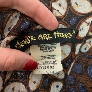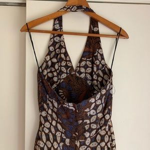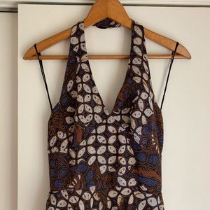 Absolutely BREATHTAKING vintage maxi dress appropriate for formal wear (prom, homecoming, evening wedding or fancy date). Brown, dark blue and white gauzy fabric. Bodice fits snug at natural waist, halter secures at neck. This is a vintage 9/10 but fits like a 4/6. Gorgeous flowy skirt and absolutely one of a kind. I hate to let this go but it doesn’t fit me anymore. Zip closure in back.