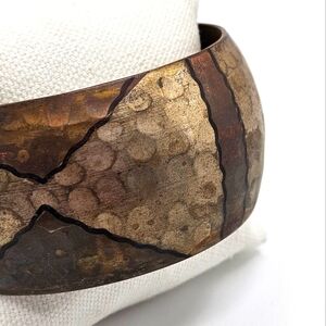 Vintage large bangle style bracelet. Brass with a geometric pattern and black details. Measures a little over 2.5" across inside and about 1.5" wide. Marked made in India. Purchased from an estate and no visible maker's mark. Some tarnish/patina as shown - could be cleaned if desired. Excellent condition besides and smoke-free home.