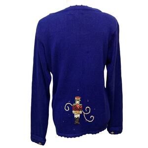 Vintage Bright Blue Ugly Christmas Cardigan Sweater by Arriviste. Adorned with needlepoint Christmas motifs, beads and sequins. 55% Ramie 45% Cotton. Small shoulder pads. Size small. Bust approximately 20.5” flat across. Length approximately 24”.