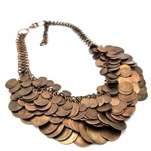 Vintage bronze-tone metal disk statement necklace. Chainmail backing. Adjustable oversized lobster clasp back close. Measures up to 22" long. Purchased from an estate and no visible maker's mark. Normal patina that could be cleaned if desired. No other issues to note and smoke-free home.