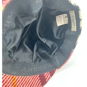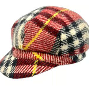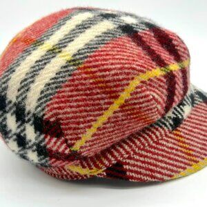 Red, cream, and black tartan wool cap from Burberry. Made in England.