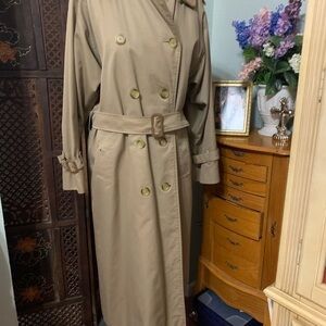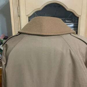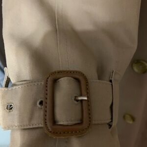 Gorgeous double breasted trenchcoat has a zip out lining and removable collar , belted can be worn, open or closed , classic style perfect for all seasons and occasions dress it up or down , fabric is waterproof cotton gabardine inside zip out lining in wool blend