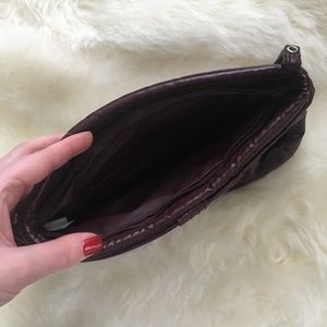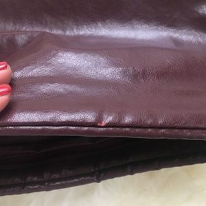 Dark Burgundy Faux leather clutch with wristlet strap. Zipper compartment inside. 12 in x 8 in. World Fashion-Right Accessories, Inc. Made in Taiwan R.O.C. 1980s.