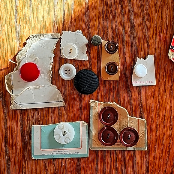 Vintage button lot. Brands unknown but possible BWC, Muscatine, Iowa. All came in a sewing bin with 1940's sewing items. Genuine pearl, acrylic, and fabric. some on original card. 🙂