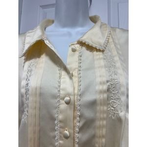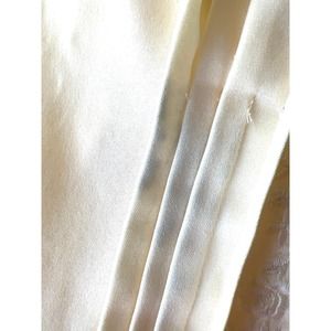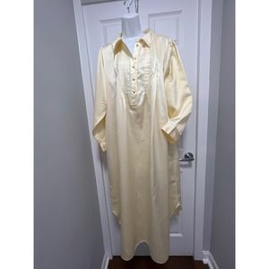 Vintage pale yellow satin silk nightgown by Cabernet, size L. Crafted with exquisite 86% polyester and 14% cotton, this nightgown features elegant slits on the sides, measuring 24” from pit to pit, with sleeves at 22 1/2 inches and a length of 51 inches. In excellent condition, meticulously cared for in a smoke-free, pet-free home. It’s worth noting that there are barely noticeable stains on the front edge, which in no way detract from its elegance and distinction. This nightgown, now in a soft pale yellow hue, remains a comfortable and luxurious option for a cozy night’s sleep.