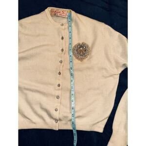 FULLY LINED VINTAGE CREAM OR VANILLA COLORED CARDIGAN WITH A BEAUTIFUL CREST DECORATED WITH TINY PEARLS, BEADS, AND TINY RHINESTONES. THE SWEATER HAS RHINESTONE BUTTONS. MEASUREMENTS IN PHOTOS. ONE TINY STAIN ON SLEEVE AS PICTURED. THERE IS A DESIGNER LABEL BUT I CAN'T MAKE OUT WHAT IT SAYS.