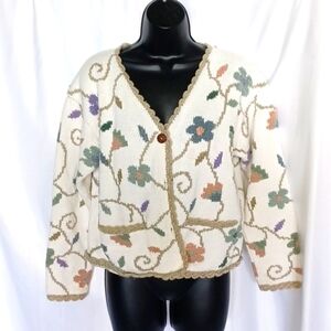 VINTAGE CARDIGAN SWEATER, KNIT FLORAL TRIM, VINE DETAILS; DISTINCTIONS, PTP-20"