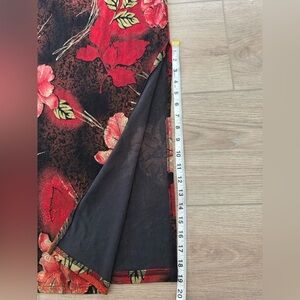 Elegant skirt with vibrant red floral patterns and green leaves. Perfect for a stylish look.