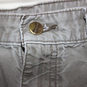 THESE WERE PANTS AND CUT OFF TO MAKE SHORTS SEE 4TH PHOTO TO SHOT CUT AND SEAM. HAVE FABRIC CLUE OR BINDING IRONED ON. HAS LEATHER "CHARHARRT" TAG ON BACK POCKET. SIZE /FABRIC LABEL IS MISSING HAS SOME STAIING ON FRONT BUT IN GREAT USED CONDITION BRASS COLORED "CARHARTT" BUTTON IN LIGHT GREEN COLOR