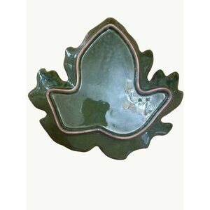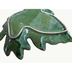 A stunning vintage ceramic dish shaped like a green maple leaf, unmarked. Perfect for decor or serving.