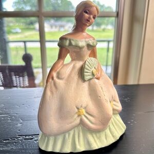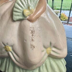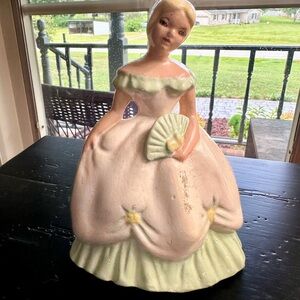 VINTAGE, CHALKWARE SOUTHERN BELLE FIGURINE. APPEARS TO BE SOLID. HAS SOME SCRAPES & CHIPS(shown in pictures). 5 1/4”W X 7 1/2”H