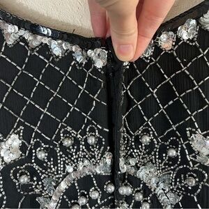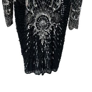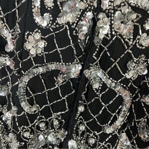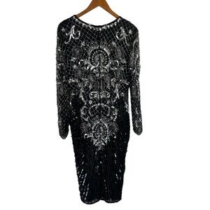 VINTAGE CHAMPELLYSE Great Gatsby Beaded Cocktail Long Sleeve Midi Dress. Scoop neck. Silk body with intricate silver beading throughout. Absolutely stunning piece! Hidden back zipper. Fully lined.