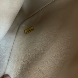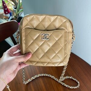 Beige vintage Chanel lambskin camera bag mixed with silver hardware. Can fit a phone, keys, and card holder.