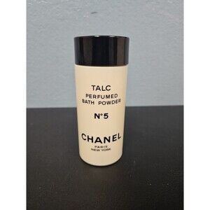 This vintage Chanel No. 5 Talc Perfumed Bath Powder comes in a 5oz plastic container. The powder is scented with the iconic No. 5 fragrance from Chanel. It is a collectible item that provides a luxurious and indulgent experience for the user. The product has been previously used, adding to its charm and vintage appeal.