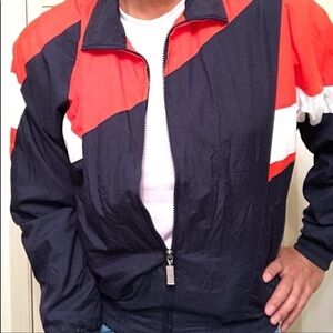 CHEER UP: Fun vintage windbreaker zip up POWER CHEER DANCE ALL STARS stitched on back. Fun orangey red color and navy blue and white color way. Elastic waist and wrist cuff.