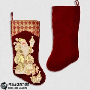 Vintage 90’s Christmas Stockings Velvet Appliquéd Felt Santa & Gifts in Red & Gold