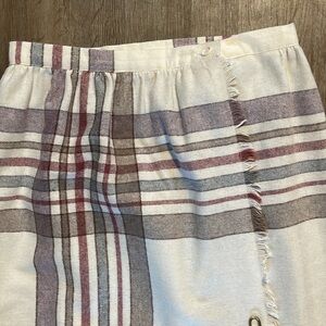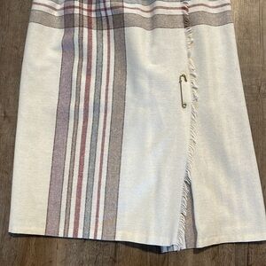 STYLE: Rare Vintage Claude plaid midi skirt, wrap like detail with fun brass safety pin detailing, wool blend fabric, soft, fray hem detailing, hits more high waisted, from the 70's, scottish inspired design, 45% Acrylic, 30% Polyester, 25% Wool