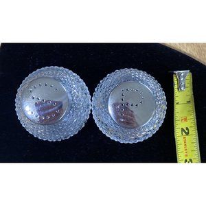 VINTAGE CLEAR GLASS HOBNAIL SALT & PEPPER SHAKERS "S" "P" Caps Vintage. I can’t make out the letters on the bottom. Sweet vintage pair.