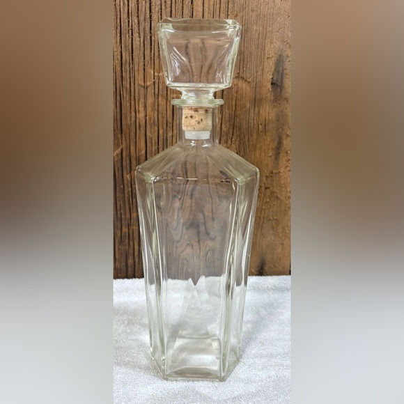 This vintage clear glass liquor bottle with a glass stopper is a stylish and classic addition to any bar or kitchen decor. The mid-century modernism style and rectangular shape give it a unique and elegant look. The set includes glasses, making it perfect for entertaining or everyday use. Crafted from high-quality glass, this decanter adds a touch of sophistication to any space.