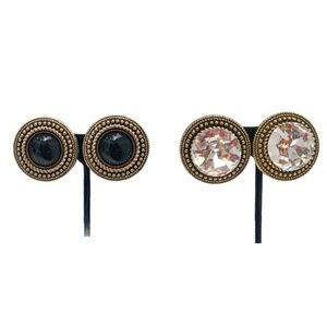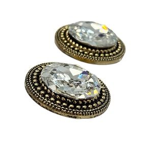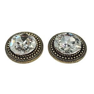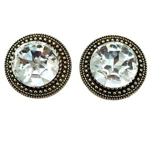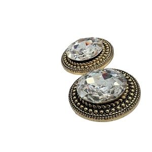 Vintage clip on earrings in gold tone bead design with a faceted clear center. The faceted center is 1.25" across. There is a bead design around the center. 1.5” Diameter. In very good preowned condition.