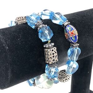 Vintage set of 2 silver tone, glass/crystal, and cloisonné bead stretch bracelets in excellent preowned condition. One bracelet has large clear stones flecked with pale blue. The other has blue cloisonné beads. Both have light blue crystal beads with the silver tone spacers and decorative beads. Both are approximately 3 1/2" across.