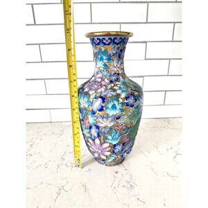 This vintage Cloisonne enameled vase is a beautiful piece, showcasing intricate brass floral designs. this vase embodies traditional artistry. Its unique and detailed craftsmanship makes it a valuable collectible for those interested in Asian cultures and ethnicities. Perfect for adding a touch of elegance and history to any home decor or collection. Its a vintage piece not in perfect condition. I circled areas where there are some dents that are to notice and picture due to the nature of the details.