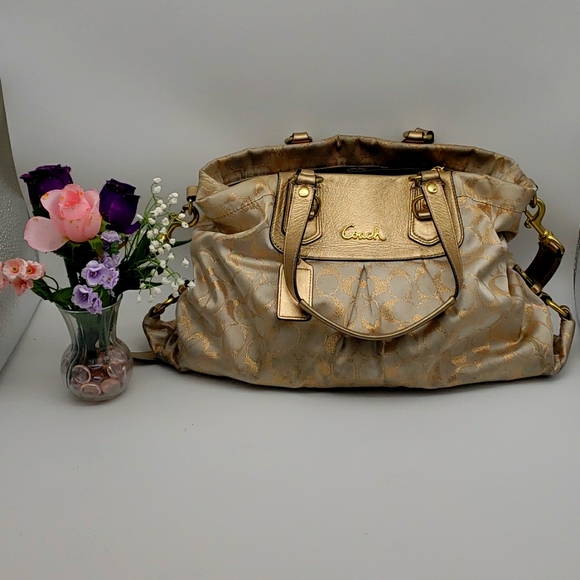 Coach large gold shoulder bag holds a lot! There are 2 compartments inside along with 2 slip pockets and a back zipper. Shoulder strap drop is 12 inches. Handle drop is 5 inches. There are a few scuff marks along the bottom which are not very noticeable. Please see pictures 5 and 6.