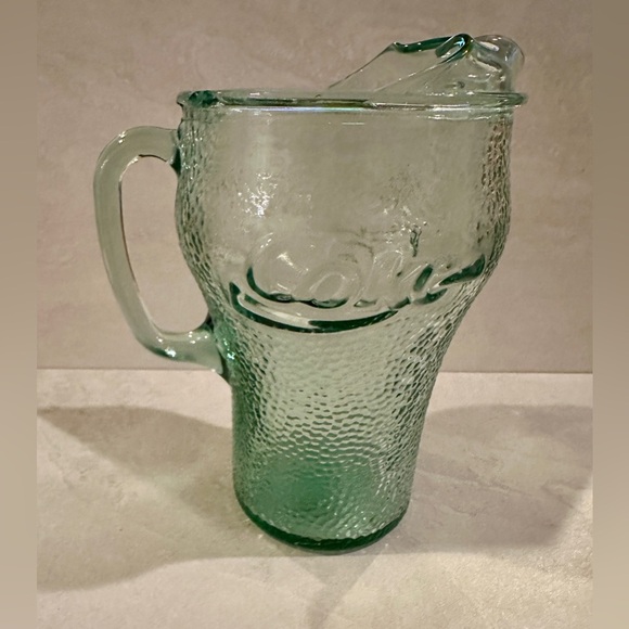 VINTAGE COCA-COLA HEAVY GREEN PEBBLED GLASS 64 0Z COKE PITCHER-WITH ICE LIP