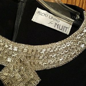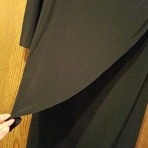 SO ELEGANT HOLIDAY/ BLACK MIDI FORMAL DRESS/ GORGEOUS VINTAGE SEWN ON SILVER BLING ON NECKLINE / SLIGHT DRAPED LOOK ON LEFT FRONT/WIDE ARMHOLE TAPERED TO LONG SLEEVE/ DRESS FALLS STRAIGHT WITH SLIGHT STRETCH/ LOOSE FRONT DIAGONAL PANEL GIVES AN ELEGANT LOOK OF MOVEMENT/ 7" ZIPPER IN BACK AT NECK/ SHOULDER PADS CAN BE REMOVED/ PTP 20"/ MIDDLE across waist 20"/LENGTH 44" / MADE IN THE USA/ EUC / TAG SAYS SIZE 12/ USE MY MEASUREMENTS