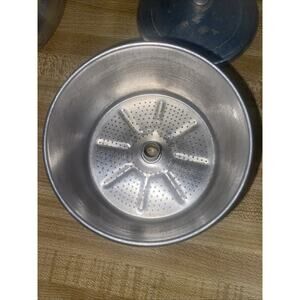Brews nine cups on your stove, indoors or out. Contains the pit, lid with clear percolator top. Coffee holder and pedestal. Pot has a built in strainer and spot. Handles and coppery gold colored. Handles on the top and side. Cup markings in the side.
