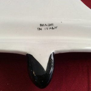 This is a gorgeous piece of a hand painted serving china platter from Italy. The condition is excellent. No chips, scratches, stains or cracks. The colors are very crisp and bright. Lovely cookie or candy serving platter with hand painted Christmas bell design. It is 12 1/2" in length and 11 1/2" wide at the bottom. From Italy, it was purchased in 1959 and has been very well cared for and mostly in storage. The back has the Made in Italy stamp. Lovely piece of serving china for your holiday dinner or party table. Dishwasher Safe.