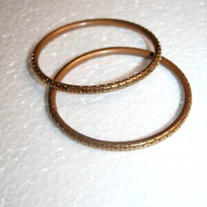 These 2 copper bangle bracelets are perfect for any occasion. The exterior of each bangle is covered with tiny holes and each measures 2 3/4 inch in diameter. These bracelets are pre-owned but in very good condition.
