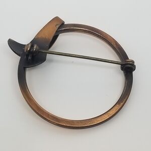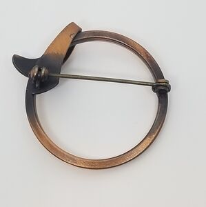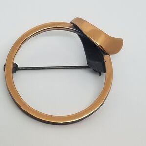 Elegant, simplistic modernist style brooch made of copper. Brooch is a simple round design with a small accent at top. Piece measures 1-3/8 inch in diameter. Great condition.