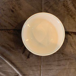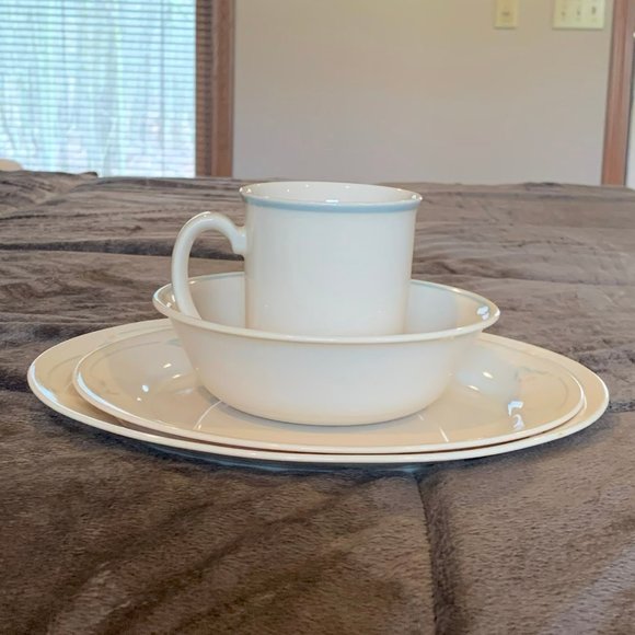 A set of 4 pieces of Corelle Windflower includes dinner plate, luncheon plate, soup/salad, bowl and cup/mug. Beige/ecru/off white/ivory with bluish band and peach flower design. Discontinued/Retired. Dimensions: Dinner plate is 10 1/4 inches in diameter Luncheon plate is 9 inches in diameter Soup/salad bowl is 6 1/4 inches in diameter Cup/mug is 3 inches in diameter and 3 3/4 inches in height No chips or cracks