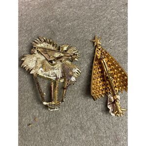 VINTAGE COROCRAFT 2 1/2" CHRISTMAS TREE & 2 1/4 INCH LANTERN BROOCHES GOLD TONE